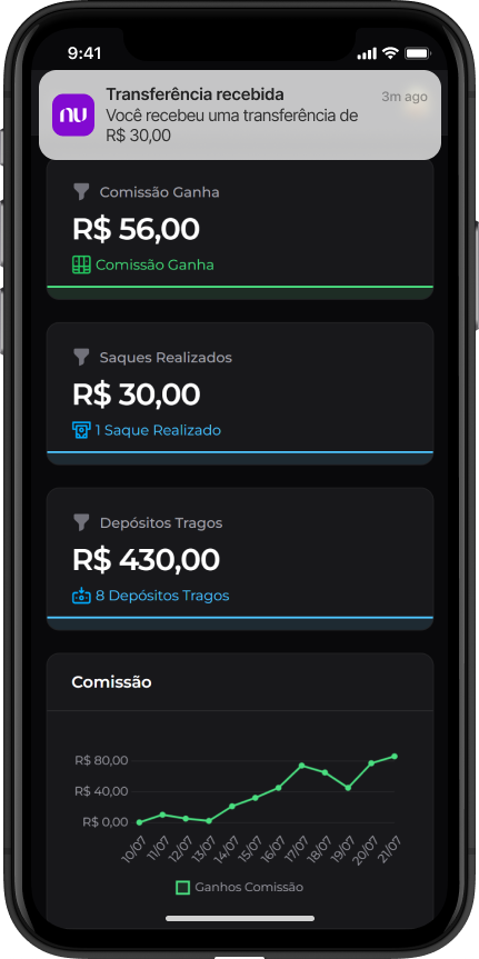 A cada depósito feito pelos jogadores que você trouxer através do seu link, você receberá uma generosa comissão.